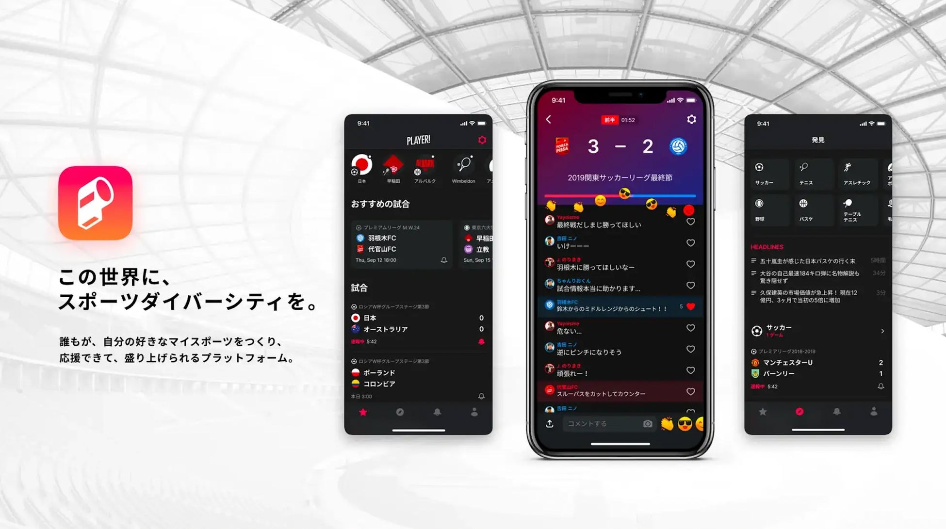 Player!は、誰もが、自分の好きなマイスポーツをつくり、応援できて、盛り上げられるプラットフォームです。