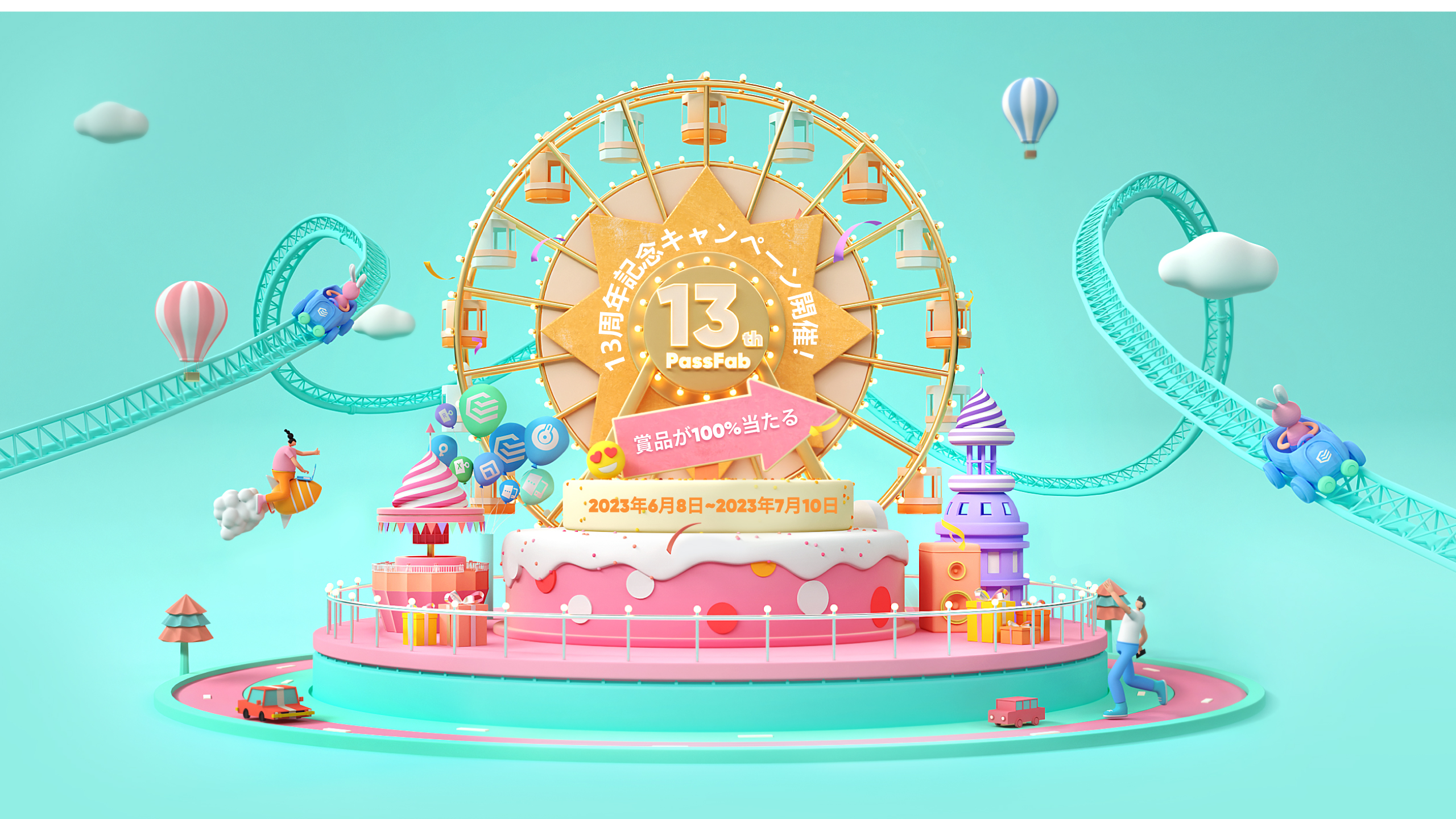 日頃のご愛顧に感謝の気持ちを込めて、13周年記念日にあたって、弊社PassFabは抽選で100名様に豪華賞品をプレセントとつ買うと1つもらえるセールを行います。
