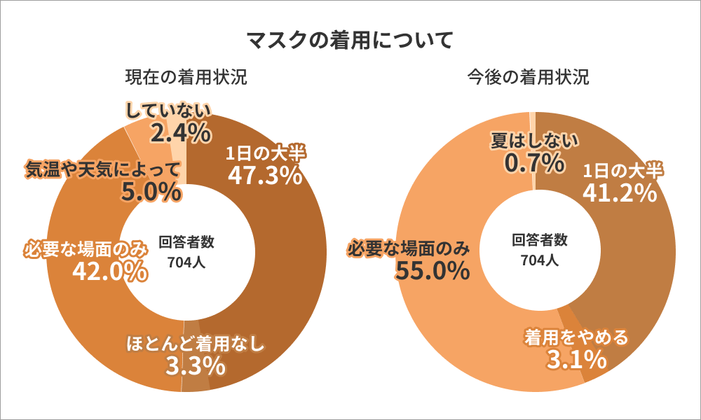 また熱中症リスクを高めると言われる夏のマスク着用について”現状”では「1日の大半着用」の回答が半数弱で最多に対して、”今後の着用”については「必要な場面のみ着用」が過半数超で最多回答になりました。しかし、「今後着用をやめる」は3.3%に留まっていることから、今夏の猛暑に伴う熱中症リスクよりも、2年以上続いたマスク着用の文化が意識的に上回り、第7波が懸念される今夏において脱マスクが大幅に進む可能性は薄いと推測できます。