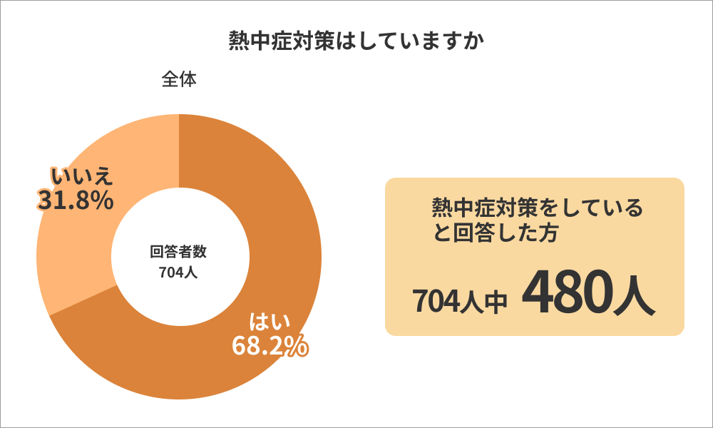 今夏の熱中症対策実施有無について、全体の68.2%が「実施している」とい回答し、「実施していない」と回答したのは31.8%でした。