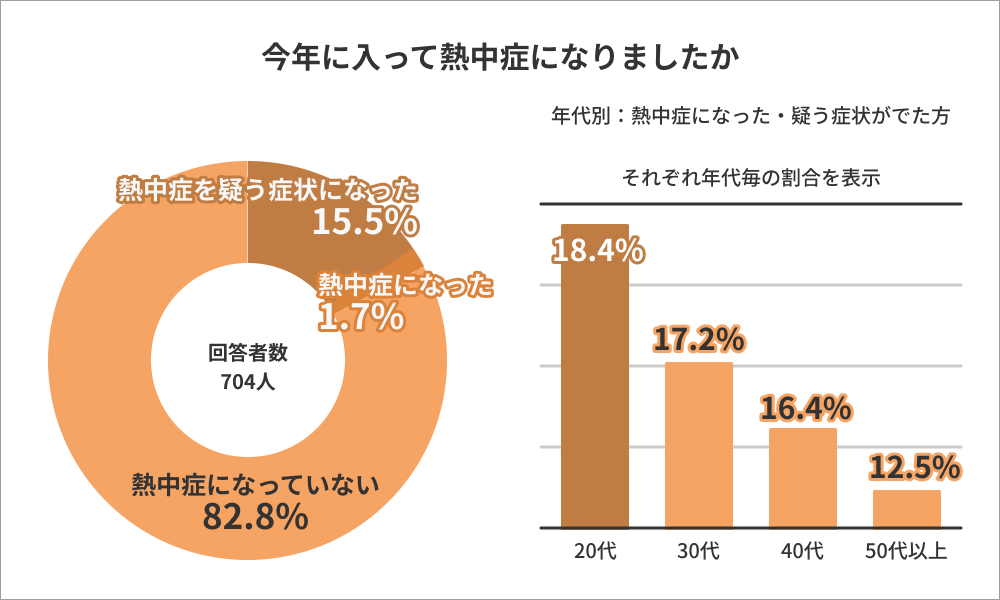 これを年代別で見ると、最も熱中症の発症・疑う症状が多かったのは「20代」の18.4%で、次いで「30代」の17.2%、「40代」の16.4%、「50代」の12.5%と年代が低いほど熱中症の発症率が高いことがわかりました。