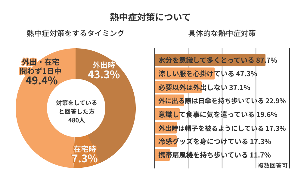 また熱中症対策をしていると回答した480人に実施のタイミングについて聞くと、「外出・在宅問わず1日中」が49.4%で最多回答になり、次いで「外出時のみ」が43.3%、「在宅時のみ」は7.3%の回答結果になりました。更に具体的にどのような熱中症対策をしているかについては「水分を意識的に多くとっている」が最多の87.7%で、次いで「涼しい服を心がけている」が47.3%、「必要意外の外出はしない」が37.1%になり、上位3つの回答結果でした。最も回答数が少なかったのは11.7%の「携帯扇風機を持ち歩いている」でした。