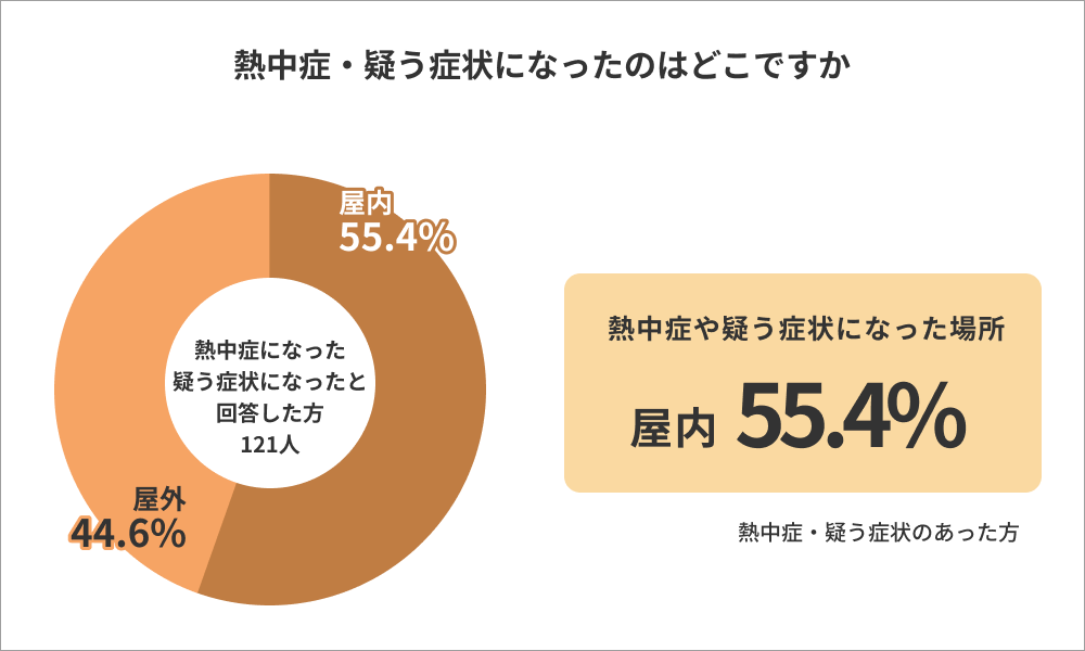 熱中症を発症または疑う症状になった際の環境については、過半数超の55.4%が「屋内」と回答し、「屋外」と回答したのは44.6%でした。これを受けてエアコン使用頻度について聞くと、全体の51.1%が「在宅時のみ」で最多回答になり、次いで「在宅・不在問わず1日中」が16.9%、「在宅の日中のみ」が13.9%、「在宅中の夜間のみ」が6.7%という回答結果になりました。「使用していない」は5.3%でした。