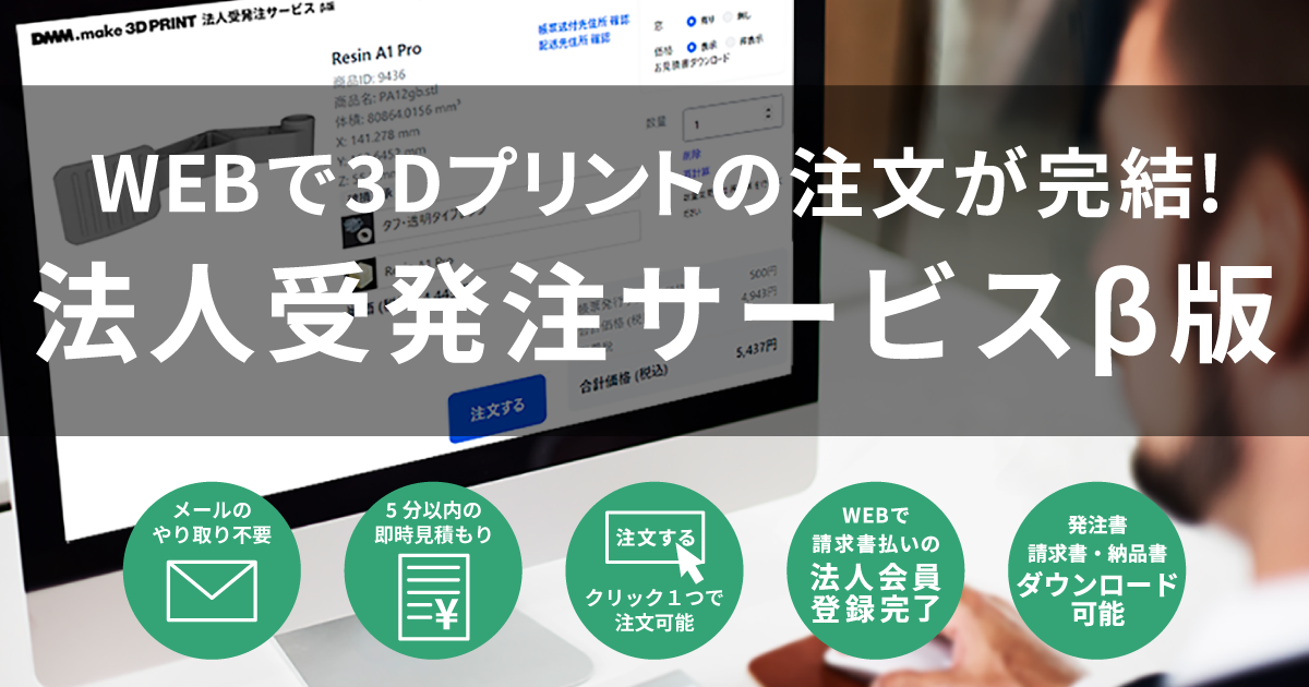 昨今、3Dプリントサービスご利用希望の新規法人企業が増加している中、より使いやすい環境を整えるべく「法人受発注サービスβ版」をリリースします。これまで請求書払いの場合、各種書類のやり取りはメール及び郵便でのやり取りとなり、大変ご不便をおかけしておりました。今後さらに新規お取引の増加が見込まれる中、少しでもご利用者の負担を軽減し、DMM.make 3Dプリントサービスを簡便に注文しやすい環境を整えたいという理由から、本サービスの開発に至りました。