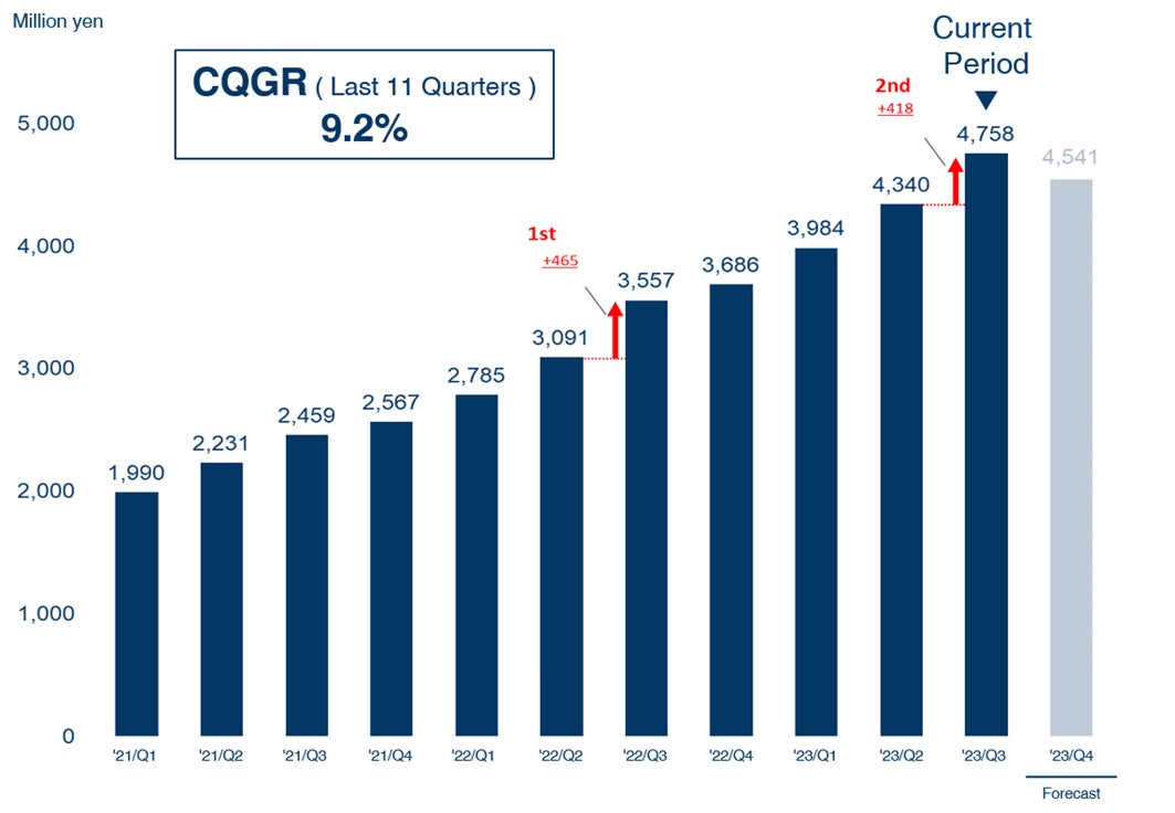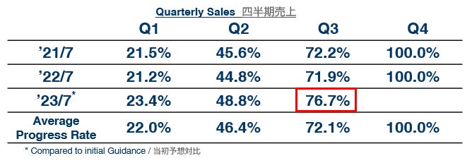 2023年7月期第3四半期について、売上高は、前年同期対比で38.7%増、前四半期対比で9.6%増となり、前期に引き続き過去2番目の増収幅となりました。