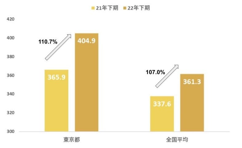 2021年下期では、新規求人の平均給与は337.6万円だったが、2022年下期では361.3万円と約7%増加している。東京都に絞ると365.9万円から404.9万円と10%以上の増加となった。