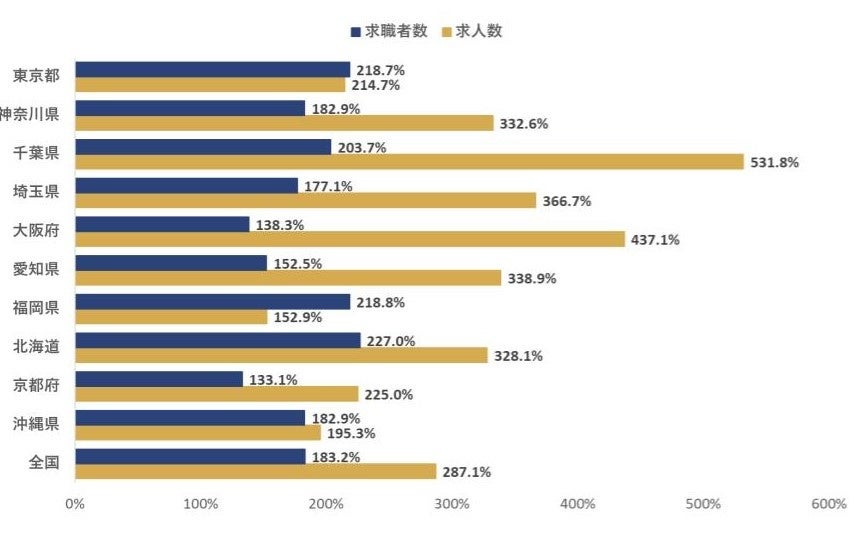 求人数については、千葉県(5.3倍)、大阪府(4.4倍)が大きく増加。一方で、福岡県や沖縄県は1.5倍以上ではあるが、全国平均に比べると伸びが小さい。しかし今後も増え続けると想定される。