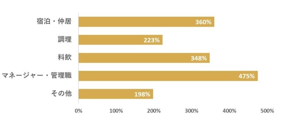全ての職種において、新規求人数は伸長している。とくに宿泊・仲居は3.6倍、料飲は3.5倍、マネージャー・管理職は4.8倍と大幅に増えている。