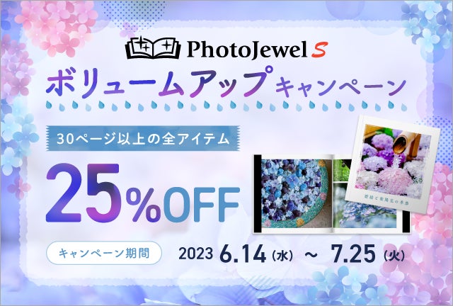 PhotoJewel Sで30ページ以上の全商品を、期間中何度でも25%OFFにて購入いただけるキャンペーンです。PCアプリを使用して、写真をたっぷり使用した表現豊かなフォトブックをお得に作成できます。
