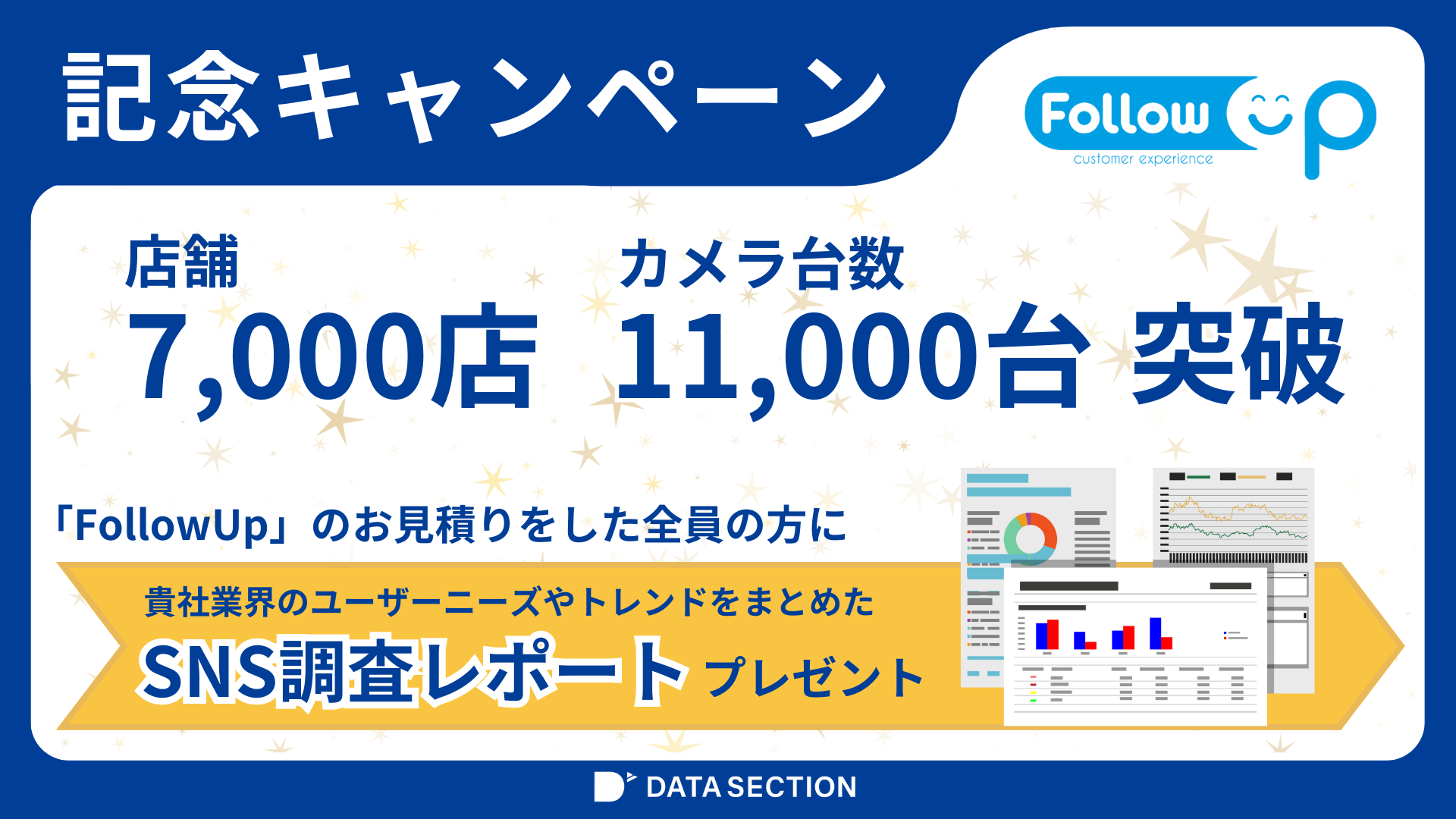 『FollowUP』の全世界に導入店舗7,000店舗、導入カメラ台数11,000台突破を記念し、『FollowUP』をお見積りまで進まれた方に、貴社業界のSNS調査レポートをプレゼントするキャンペーンを実施いたします。