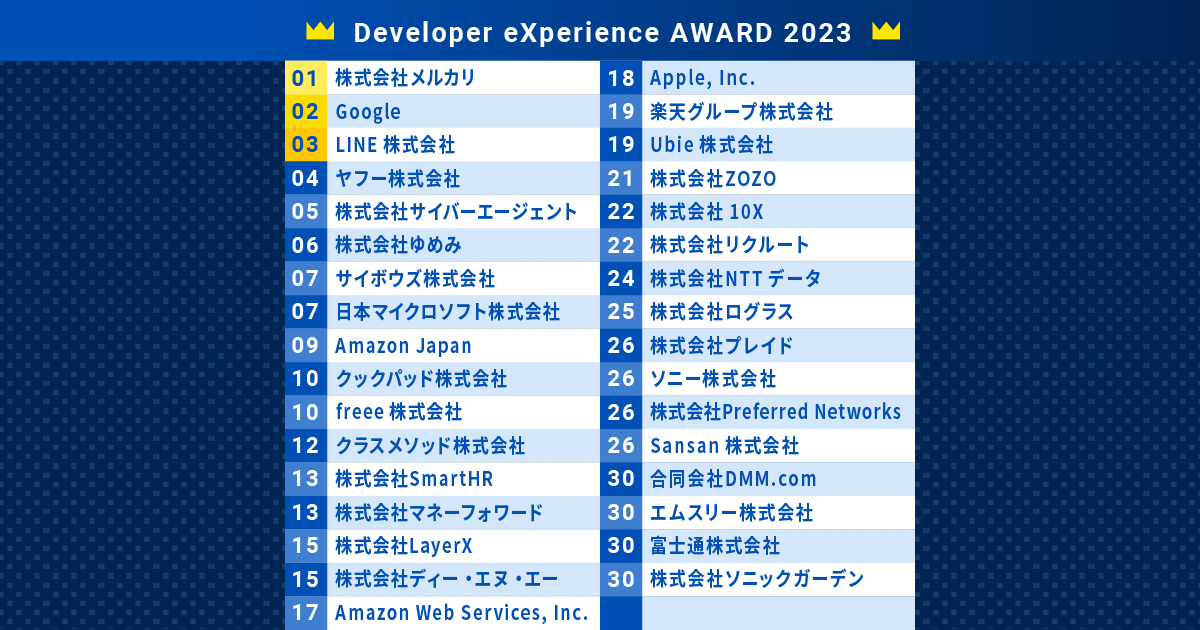 600名以上の開発者を対象に「開発者体験ブランド力」調査・集計を実施し、上位30企業を選出いたしました。その上位各社をDeveloper eXperience AWARD 2023の受賞企業として表彰を行なっています。