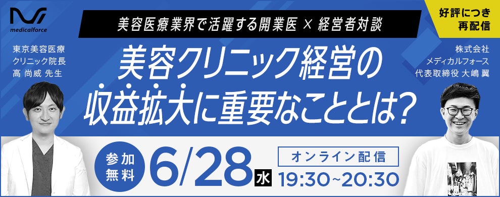 自由診療向けのオールインワンSaaS「medicalforce」を提供する株式会社メディカルフォース(所在地:東京都品川区、代表取締役社長:大嶋 翼)は、東京美容医療クリニック院長の高尚威先生をゲストにお迎えした、美容クリニック向けの特別ウェビナーを再配信いたします。日時は2023年6月28日(水)19:30~20:30、参加費は無料です。