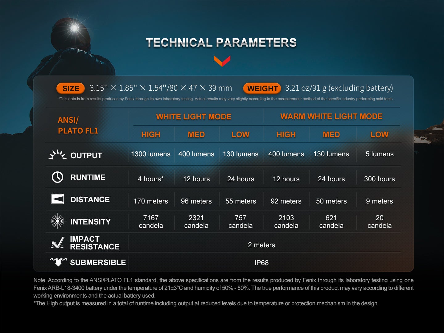 Luminus SST40のクールホワイトライトLDE(6500K)、SST20のウォームホワイトライトLED(3000K)を使用し、最高1300ルーメンに達することができ、最長の照射距離は170mメートルです。