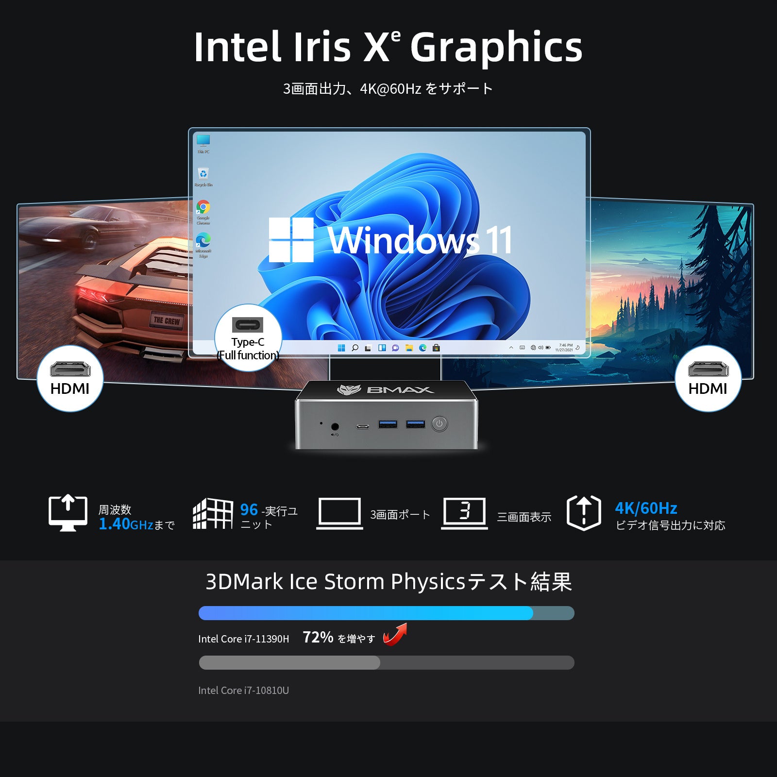 BMAX B7 Power は、第11世代Intel Core i7-11390H プロセッサーと高速16GBデュアルチャネルDDR4 SO-DIMMメモリ、超高速1TB SSDを組み合わせることで、起動時間の改善とアプリケーションプログラム起動の高速化を実現しています。ダウンロード、映画鑑賞、動画編集、デザインなど、ハードで効率的な作業に適しています。4コア8スレッド、12MBのキャッシュ、10nmの先進技術、パルス周波数5.00 GHz。