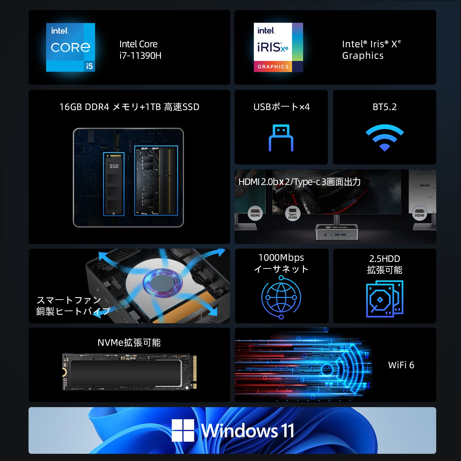 高解像度4K UHDディスプレイや3画面出力に対応しています。HDMI 2.0b×2、Type-Cポートを介して、テレビ、モニター、プロジェクター、プリンターなどに接続できます。3画面同時出力で生産性を高め、マルチタスク機能を強化します。コストや管理の負担を軽減しました。第11世代のi7-11390Hは、より安定した画質が得られます。4K再生も問題なし。PS、ビデオクリップ、YouTubeなどをスムーズに実行できます。