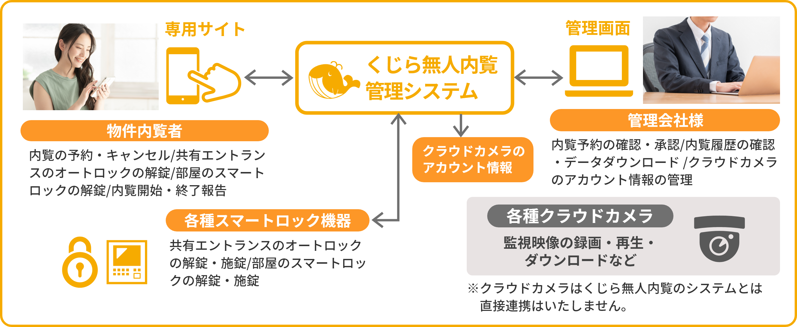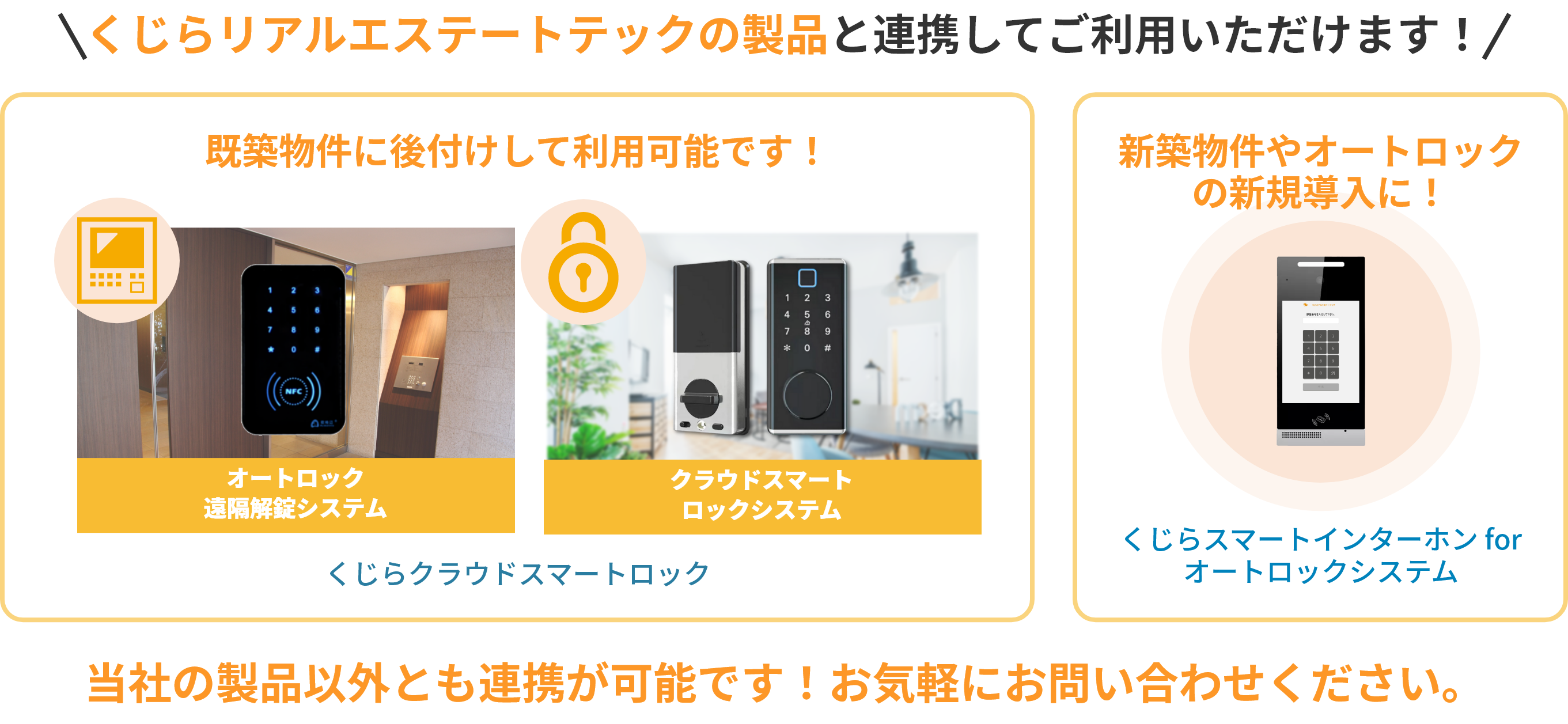 くじら無人内覧は各種オートロック遠隔解錠システム、各種クラウドスマートロックシステムと連携します。対応機種に関しては個別にお問い合わせください。くじらリアルエステートテックの製品であるくじらクラウドスマートロックやくじらスマートインターホン for オートロックシステムとの連携も可能です。