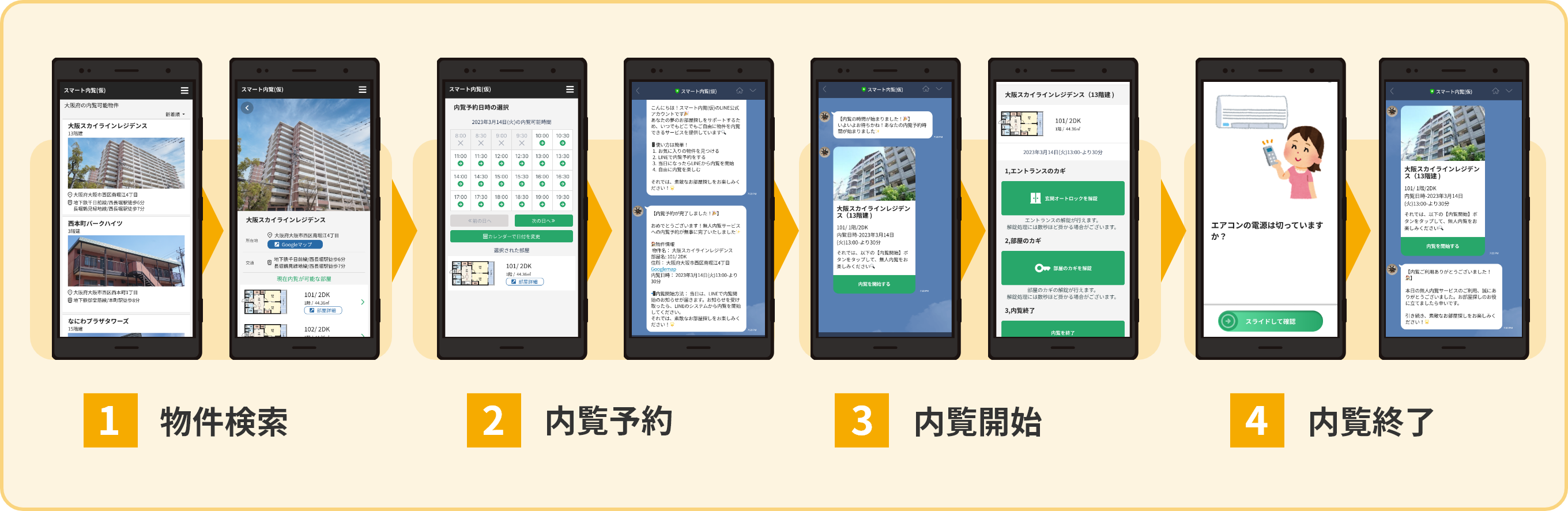 内覧者がLINEの専用アカウントを友達追加することで、専用サイトから内覧したい物件を検索することができます。内覧したい日時を選択すると、内覧予約者のLINEアカウントに予約完了メッセージが送られます。