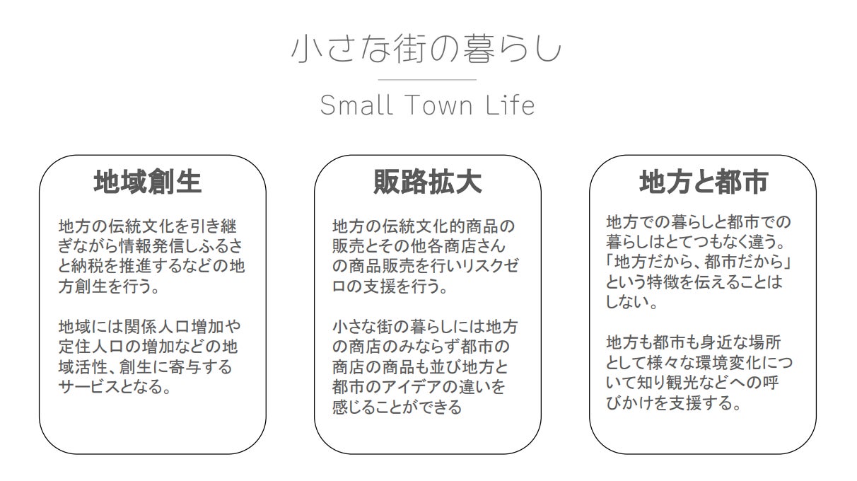 小さな街の暮らしは、NFTやメタバースを活用して、ふるさと納税を推進し地方と都市を繋ぎ各商店の販路拡大を目指す。また、独自でアパレルブランドを運営する予定である。小さな街の暮らしから地方創生としてNFTやメタバースの活用をはじめるとしてまずは毎月1回のメタバース交流会が開催される。中高生にも人気なメタバースプラットフォームで毎月交流会が行われそこでは、抽選会も行われる。抽選にあたれば、小さな街の暮らしが運営するアパレルブランドの商品と引き換えとなるNFTクーポンが発行される。