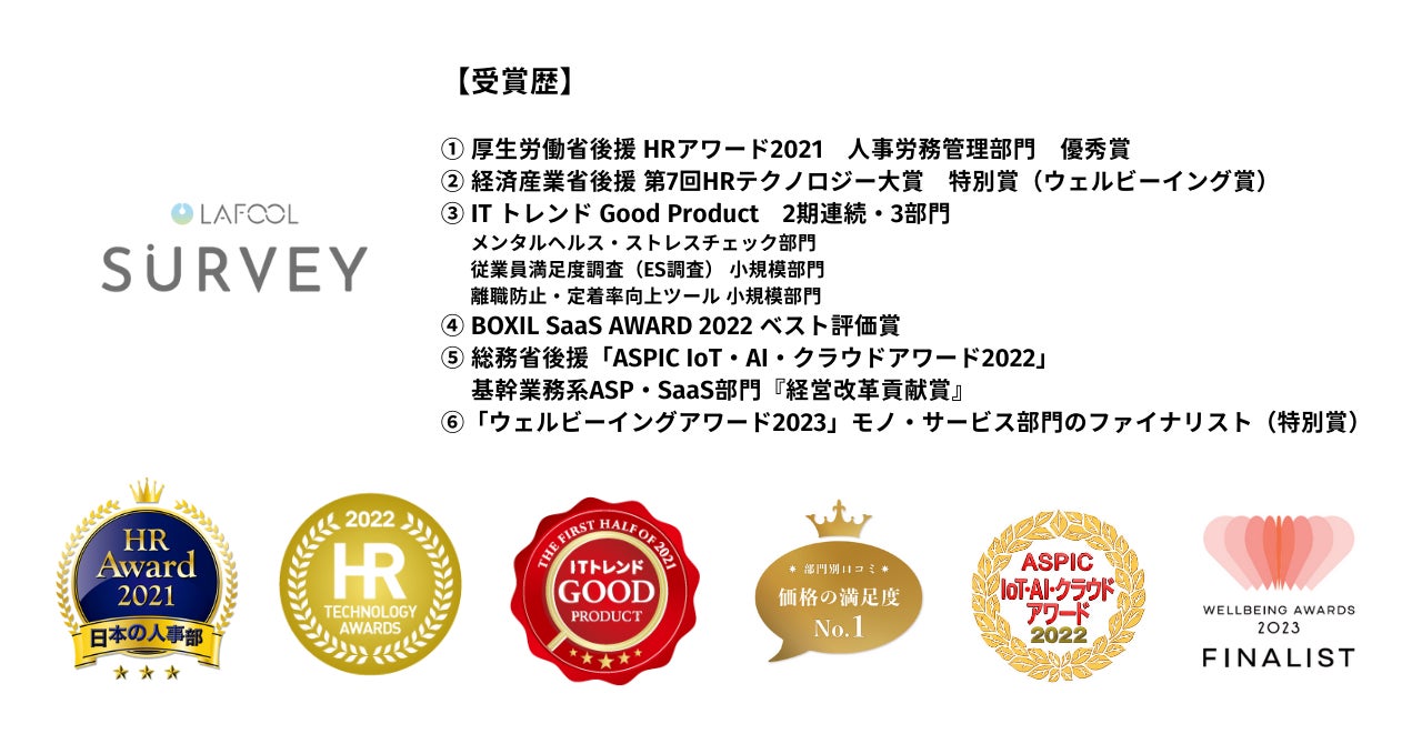 「ラフールサーベイ」は組織と働く個人の可視化と行動変容を促し、生産性向上と離職防止をはじめとした人的資本経営の実現を支援するサービスです。サービス提供から約3年で、累計1,500社が導入。「個人が変われば、組織が変わる。」というサービスのコンセプトに基づき、個人のセルフケア意識を促進する機能も搭載しており、心身のセルフマネジメントを促進し組織改善に繋げる特徴的なサービスであると高く評価されました。