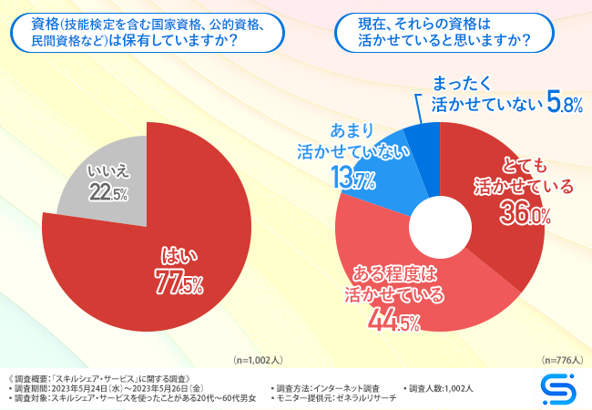 「資格(技能検定を含む国家資格、公的資格、民間資格など)は保有していますか?」と質問したところ、7割以上の方が『はい(77.5%)』と回答しました。