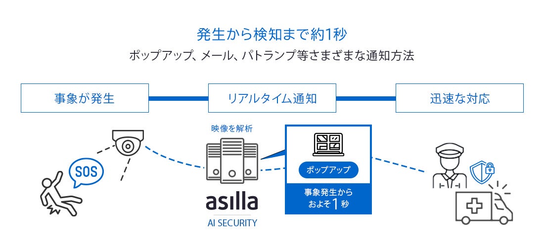 『アジラ』は、世界トップクラスの行動認識技術を基にしたAI警備システムです。既存のカメラをAI化し、異常行動や不審行動を検出したときのみ、瞬時に映像を通知します。映像をモニタリングする警備員の業務を軽減でき、見逃しや見落しも無くすことができます。