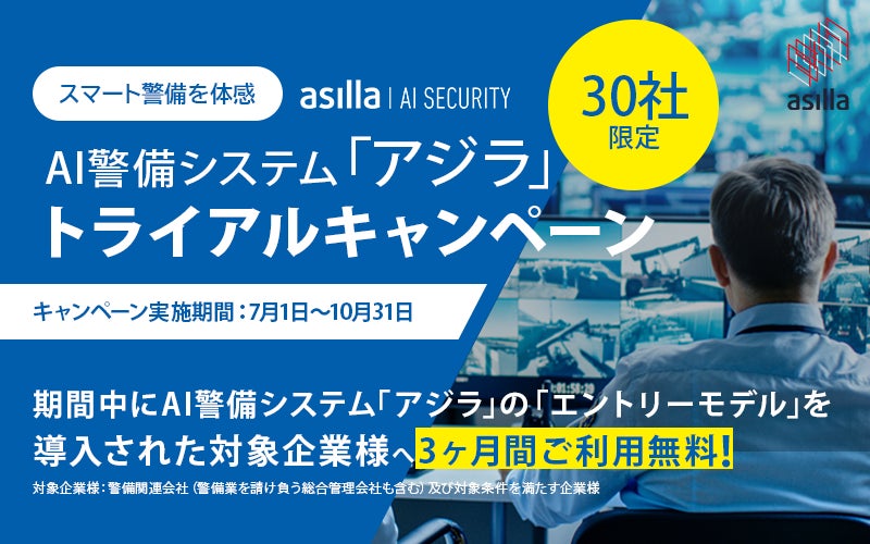 内容:期間中にAI警備システム「アジラ」の「エントリーモデル(カメラ30台処理可能)」を導入された対象企業様へエントリーモデルを3ヶ月間無料でご利用いただけます。
