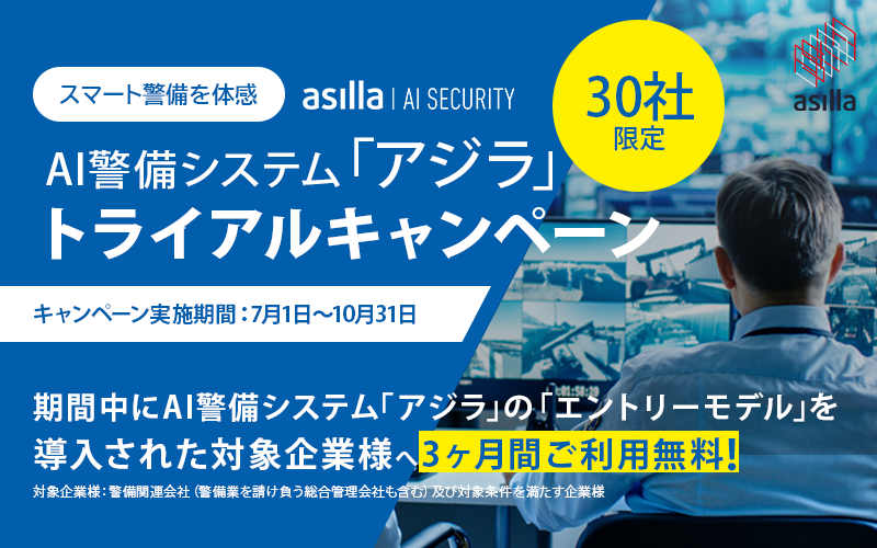 このような課題に対して、行動認識AIを利用した新たな警備アプローチを体験していただけるよう、このたび「スマート警備を体感 -AI警備システム ‘アジラ’トライアルキャンペーン」と題し、3か月の無料お試しキャンペーンを実施致します。