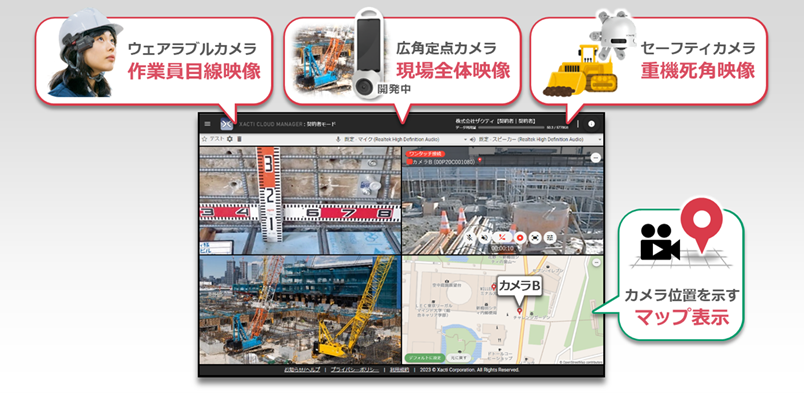 ザクティではこれまで「Xacti Cloud Manager」の主な機能として、ウェアラブルカメラを活用してリアルタイムの映像配信・双方向通話が出来る「ワンタッチ接続サービス」のほか、現場のウェアラブルカメラや重機に取り付けたAI人物検知カメラによる現場の映像を一元管理できる「クラウド共有サービス」、ドボレコ/フォクレコのカメラ映像を常時配信・録画する「LIVE&VODサービス(※2)」を提供してまいりました。2023年7月より新たに、「グルーピング機能」や「ダッシュボード機能」をオプションとして追加し、ご利用頂けるようになります。これにより、当社の「驚くほどブレない業務用ウェアラブルカメラ」の映像や、「高精度AI人物検知カメラ」による現場の映像を更に簡単に管理することができるようになり、監督業務の効率化や、映像を活用した遠隔支援による業務DXにお役立ていただけます。