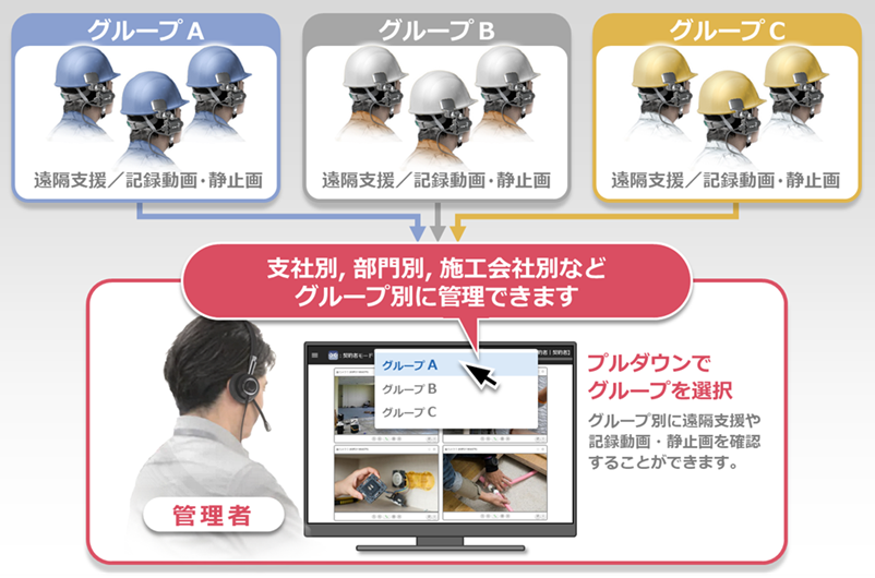 ユーザーとカメラを組織に応じたグループに振り分けることで、グループ毎に撮影した動画データ・画像データの管理や、ワンタッチ接続サービスを含む各種サービスが利用できます。グループ毎に撮影データをまとめることができ、グループ外への閲覧制限も設定可能なので、複数の協力会社で作業する現場などでご活用いただけます。