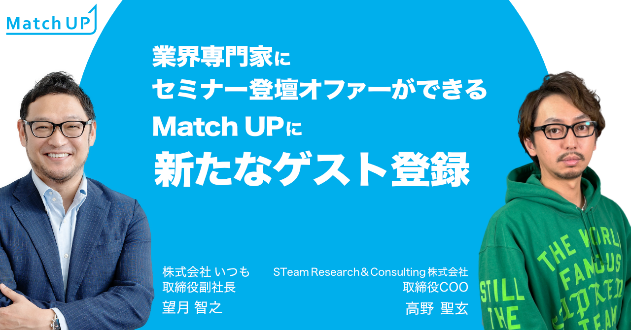 当社は、国内最大級のオンライン展示会「ITトレンド」や、ビジネス動画プラットフォーム「チラヨミ」を通して、多くの企業様、業界専門家の方とのお取引があり、自社のマーケティングノウハウを活かし、このような課題を解消するため、業界専門家にセミナー登壇オファーができるマッチングプラットフォーム「Match UP」の提供を開始いたしました。