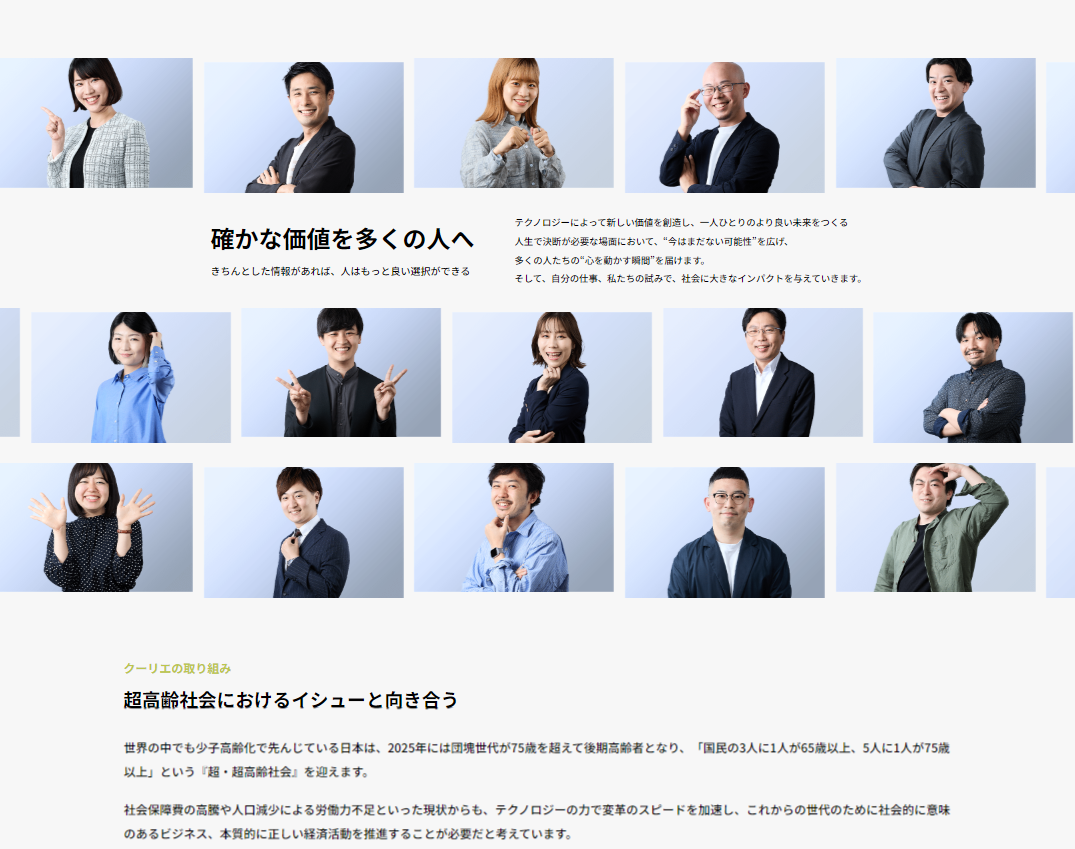 株式会社クーリエでは、「きちんとした情報があれば、⼈はもっと良い選択ができる」という考えのもと「確かな価値を多くの⼈へ」という企業理念を掲げ、デジタルプラットフォームビジネスを展開し、新たな価値創造を追求しています。