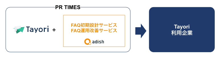 「Tayori」は、カスタマーサポートで重要となるお問い合わせの受け付けや管理、FAQによるお客様の疑問の自己解決を可能にします。一方で企業は、「FAQをどうやって作っていけばよいのか」「FAQをどう更新していけばよいか」「カスタマーサポート・カスタマーサクセス組織をどう立ち上げて運用していけばよいか」など、カスタマーサポートに関する様々な課題を抱えています。これらの課題を解決するために、アディッシュとTayoriでメニューを共同開発したプロフェッショナルサービスを、Tayori(PR TIMES)が販売、アディッシュがサービスを提供していきます。これによりTayoriの顧客は、カスタマーサポート・カスタマーサクセス領域の様々な課題を解決することが可能となります。
