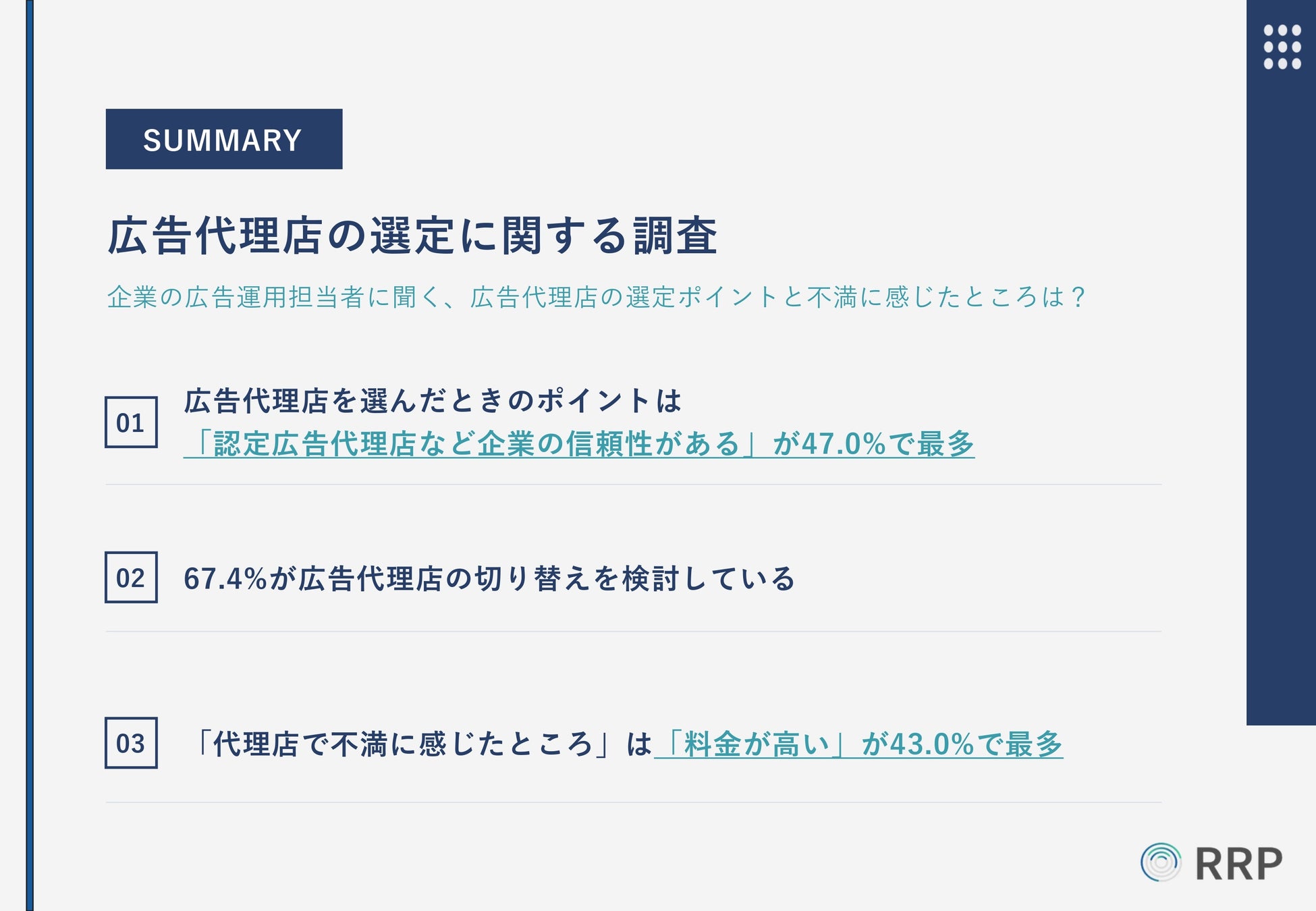 調査結果から、企業の広告運用担当者の67.4%が切り替えを検討していること、「代理店で不満に感じたところ」は上位から「料金が高い」が43.0%、「制作物のクオリティが低い」が38.6%、「広告効果が感じられない」が29.1%ということが分かりました。