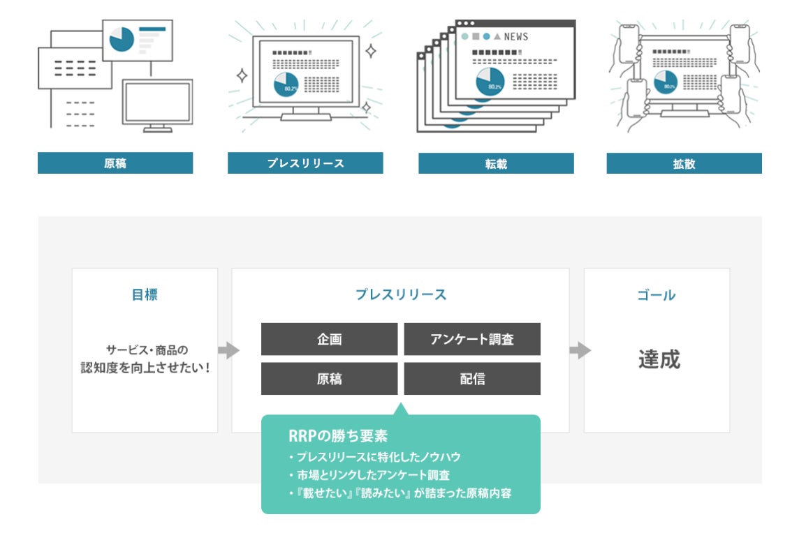 「RRP」とは、Research Release PRの略語で、ファクトデータを基にプレスリリースを打つ施策です。1,022万人もの多種多様なモニターによるリアルなアンケート結果に裏付けられたリリースが、あらゆる業界のお客様における商品・サービスの認知度向上と企業ブランディングに貢献します。