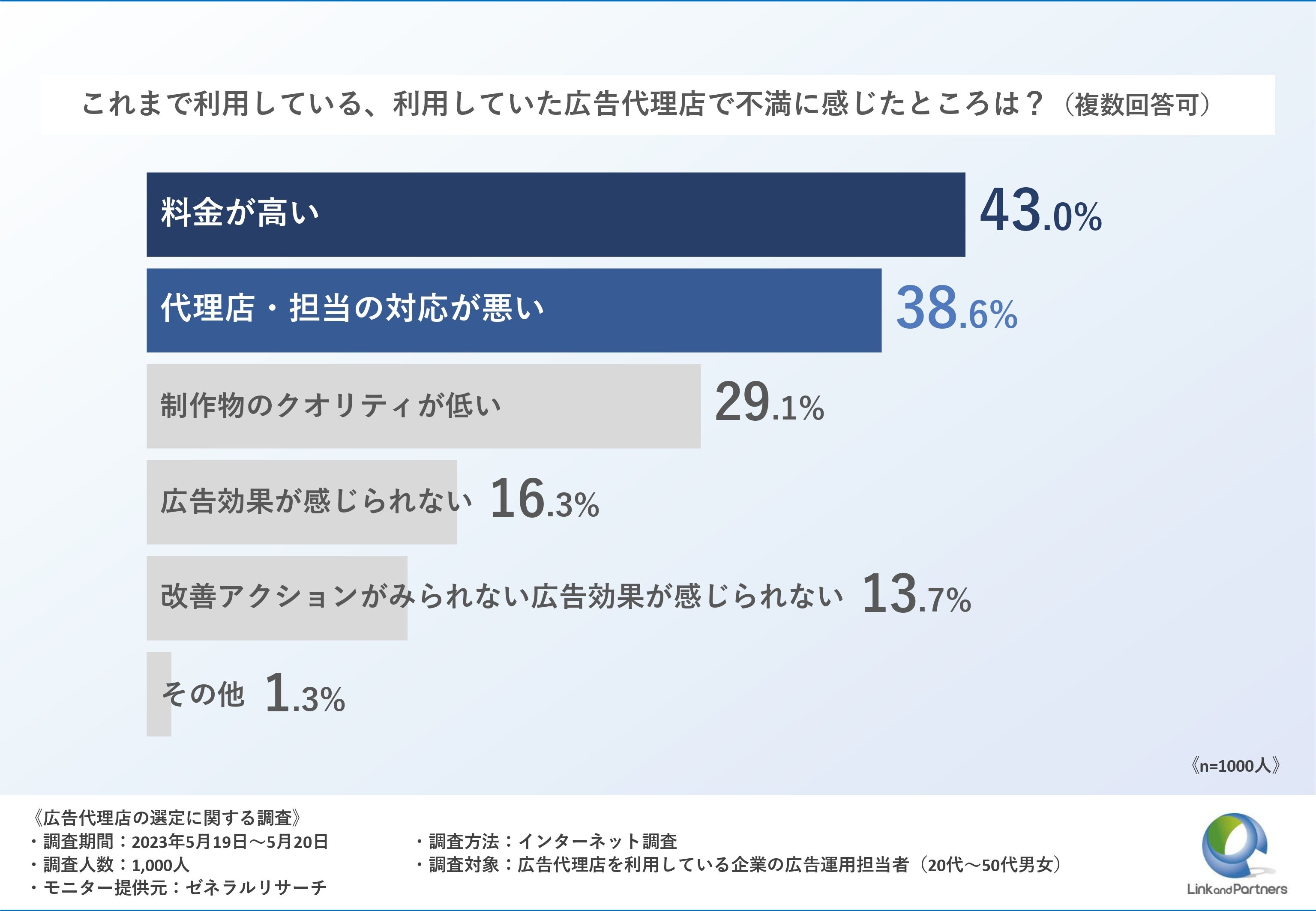 調査結果から、企業の広告運用担当者の67.4%が切り替えを検討していること、「代理店で不満に感じたところ」は上位から「料金が高い」が43.0%、「制作物のクオリティが低い」が38.6%、「広告効果が感じられない」が29.1%ということが分かりました。