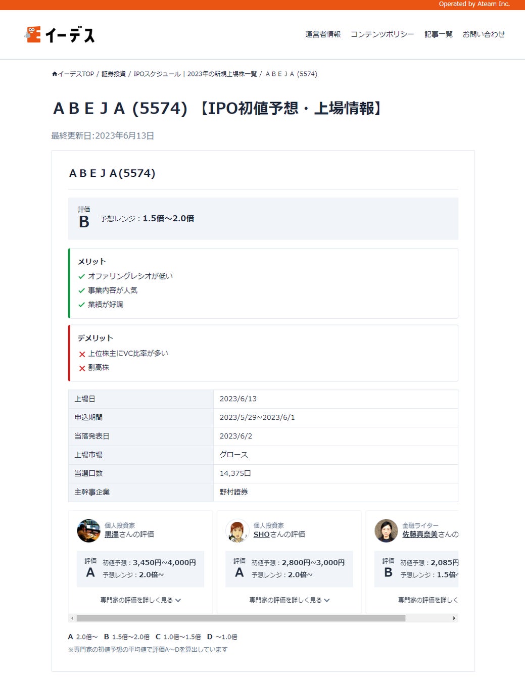 【個別銘柄の初値予想・詳細情報ページ例】