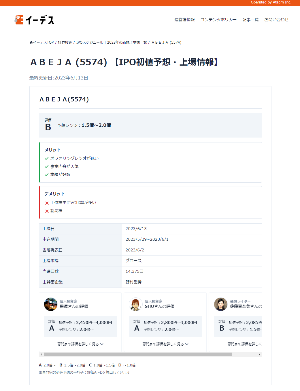 【個別銘柄の初値予想・詳細情報ページ例】
