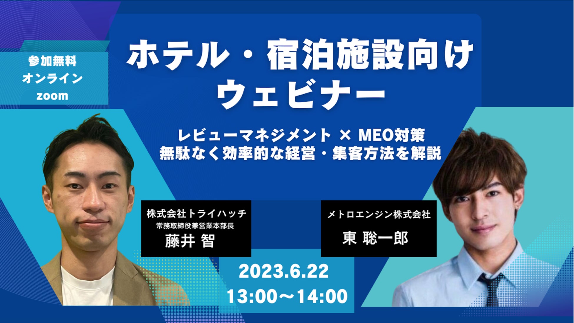 宿泊施設向けレベニューマネジメントツール『メトロエンジン』を提供し、DX化や集客支援を行うメトロエンジン株式会社(本社:東京都品川区、代表取締役CEO:田中良介、以下メトロエンジン)は、MEO 対策ツールを提供しマーケティング支援を行う株式会社トライハッチ(本社:東京都新宿区、代表取締役社長:武藤 尭行、以下トライハッチ)と共同で、6月22日(木)13:00に無料オンラインセミナーを開催いたします。