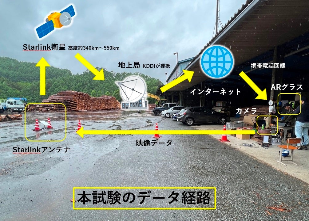 映像データの経路は、ReHawk3Dの映像配信機器からStarlinkアンテナによって宇宙の人工衛星に運ばれ、地上の地上局に戻されます。地上局はインターネットと接続しており、視聴するARグラスはau(povo1.0)回線でインターネットに接続して映像データの受信や制御信号の送信をするという経路です。