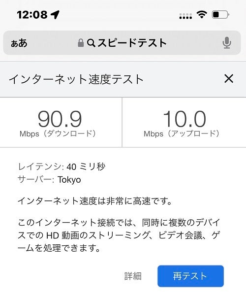 試験当日のStarlink通信速度を計測すると、アップロード10Mbps、ダウンロード90Mbpsでした。