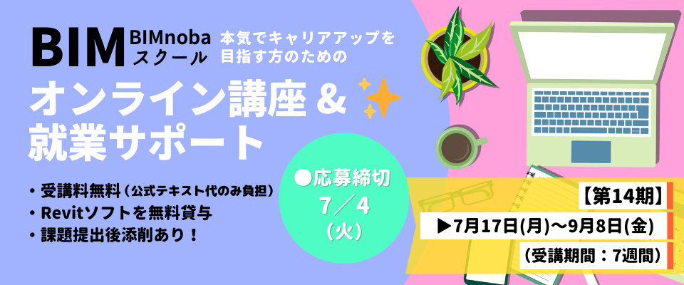 スキルの習得からキャリアチェンジまでを徹底サポートする「BIMnobaスクール」で次のステージへキャリアアップしてみませんか?eラーニング形式の研修ですので、現在就業中で休日に集中して勉強したい方にもおすすめです。ご興味のある方は、お気軽にお申し込みください。