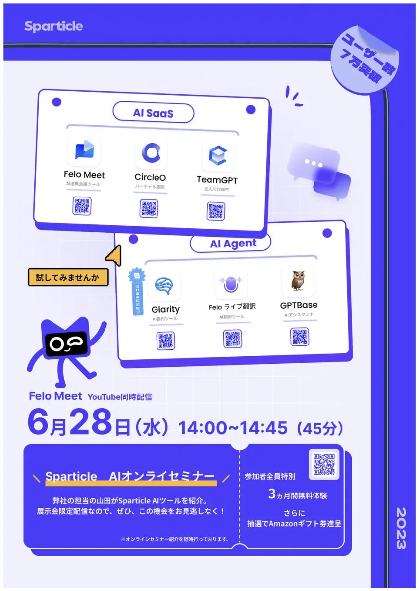 さらに、6月28日の14:00からは、Sparticle社の担当者である山田氏がSparticle社のAIツールの詳細を紹介するオンラインセミナーが開催されます。このオンラインセミナーへの参加を心待ちにしている来場者は数多くいます。Sparticle社は、AI技術の革新性と製品の多様性をアプリジャパン展示会で訴求し、来場者から大きな関心を集めています。