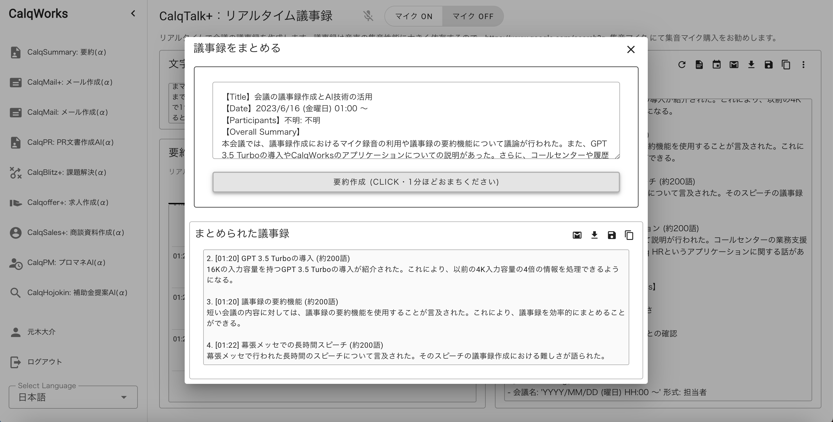 CalqTalk+に搭載された「gpt-3.5-turbo-16k」モデルは、日本時間6月14日未明に米OpenAI社より公開されたもので従来の「GPT-3.5 Turbo」モデルに比べて4倍の文章処理能力を有しています。これにより従来は1時間以上の会議の議事録作成においてAIの文字数制限により複数回AIを呼び出す必要があり非常に時間のかかる計算方法を取る必要がありました。この度のアップデートによりリアルタイム性の高いCalqTalk+において長時間MTGの高品質な議事録を生成することが可能になり、議事録のクオリティと効率性が大幅に向上しました。
