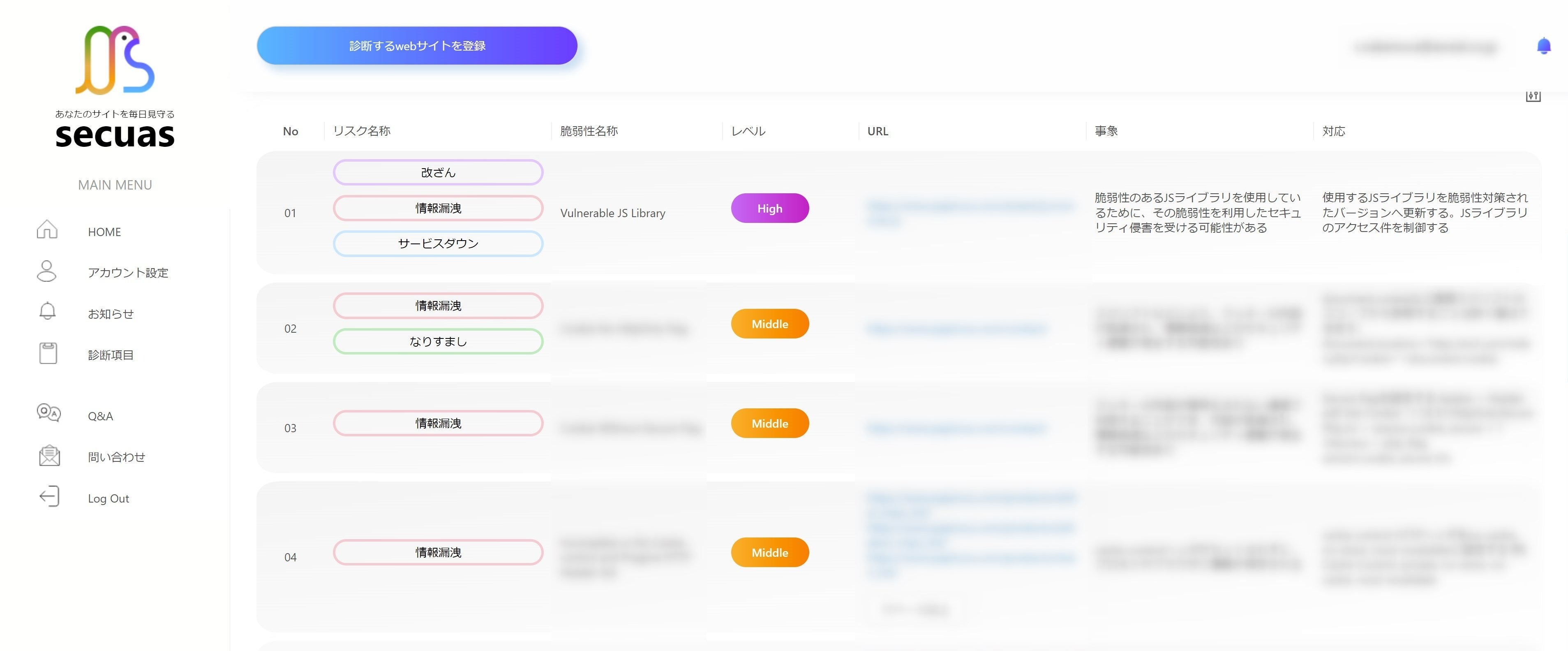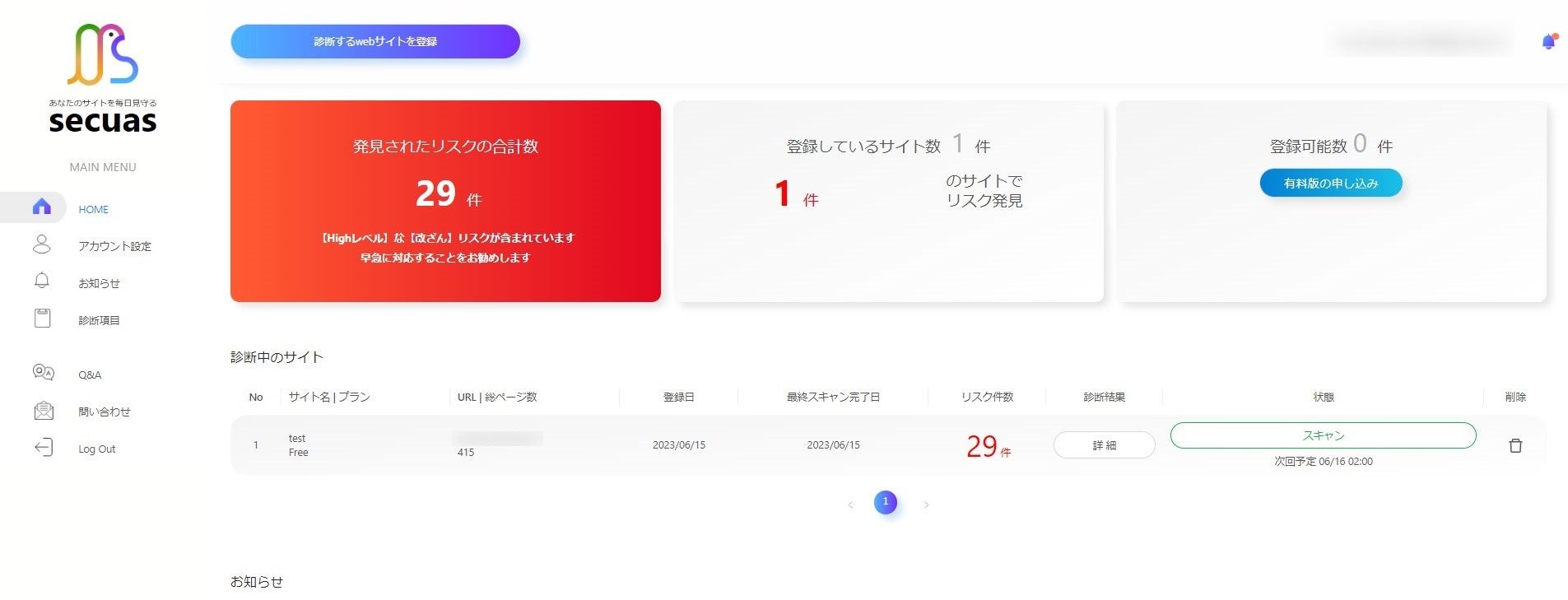 ユーザー画面:クイック診断サービスを申し込んでいただくとサイトに潜む合計リスク件数と最大リスクを確認していただくことができます。