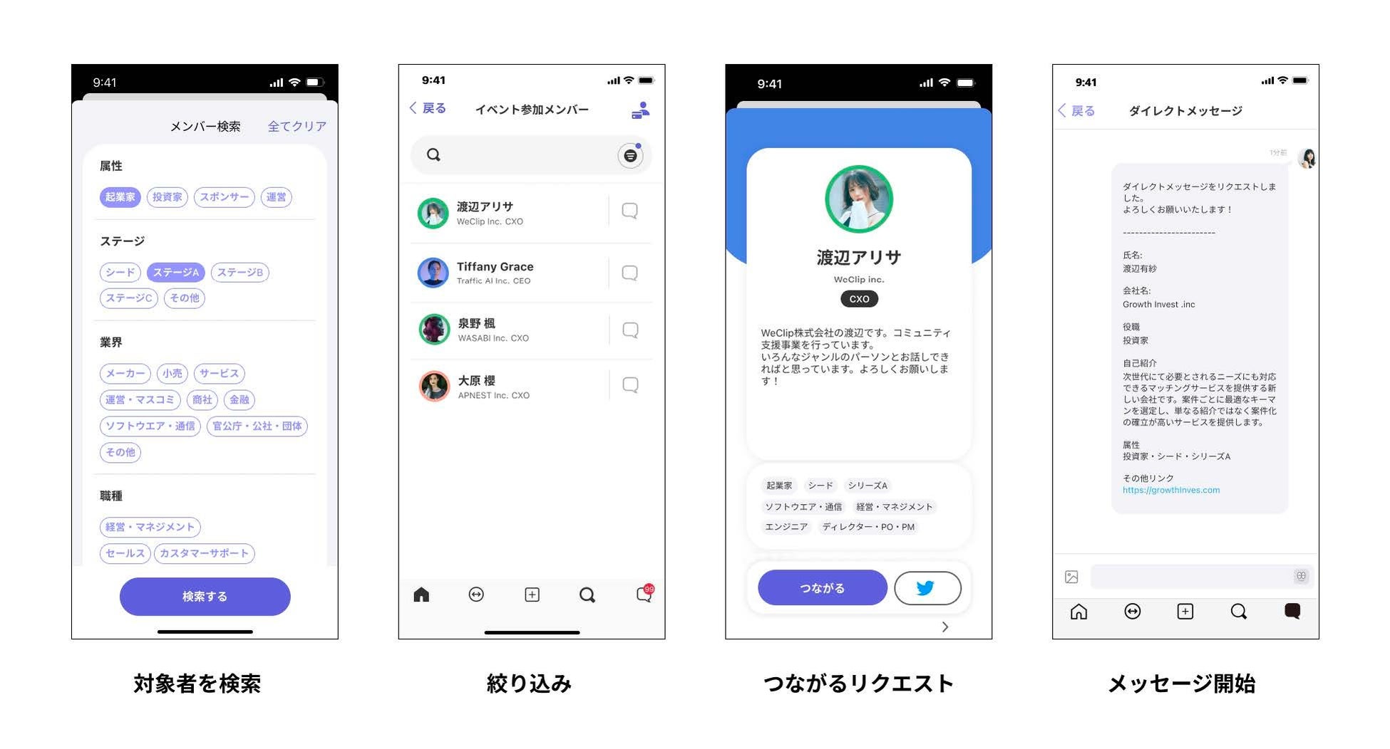 本機能は、WeClip Bizを契約した企業に限定することや、コミュニティに参加するユーザーを管理することで目的に合わないマッチングを制限することができます。これにより、信頼性の高いコミュニケーションを実現しています。