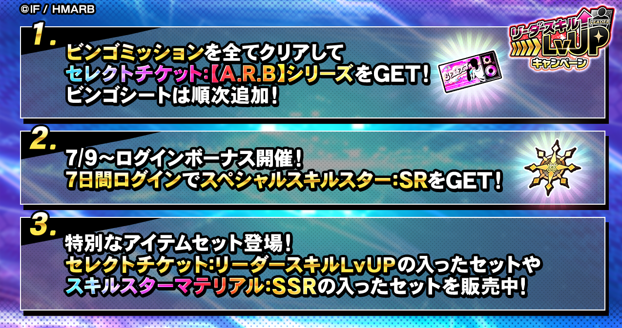期間中、ビンゴミッションやログインボーナスを開催しています。ビンゴミッションをすべてクリアすることで【A.R.B】シリーズのいずれかのカードが獲得できるセレクトチケットを入手できます。詳細はアプリ内お知らせをご確認ください。