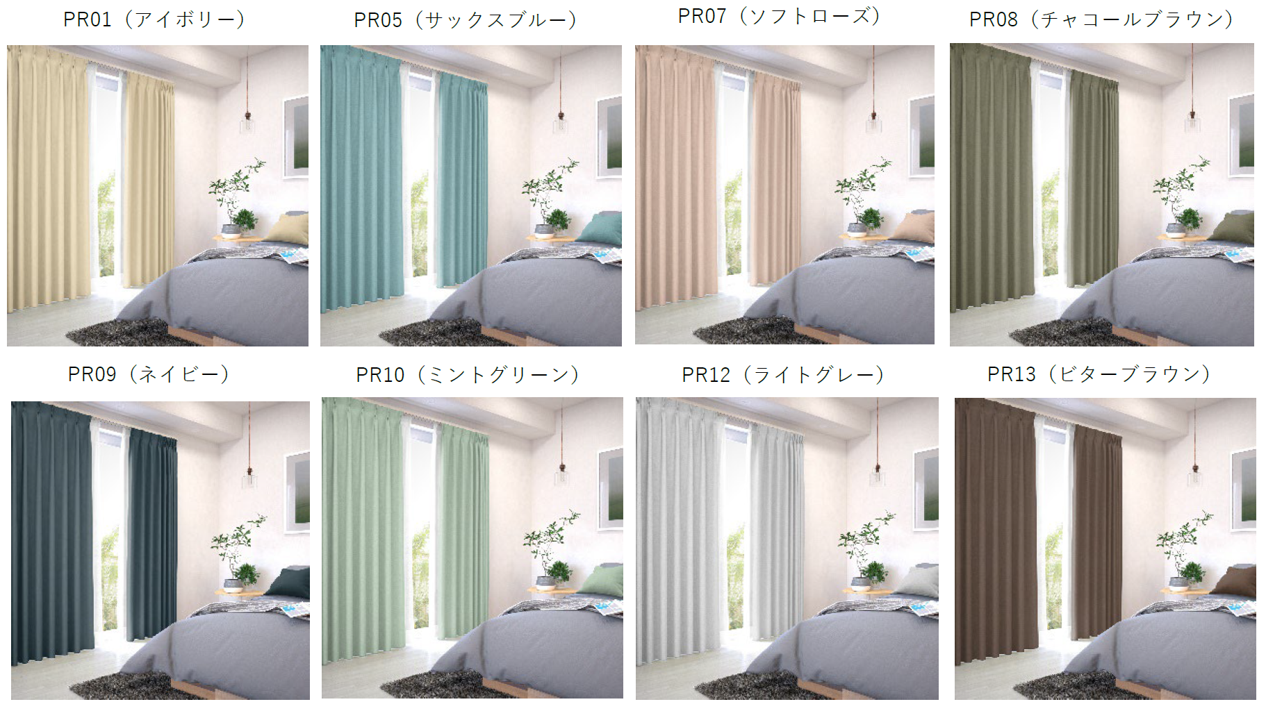 カーテン種類・・・無地(10色)、ボーダー、ストライプ(各2色)、プリント(4色)