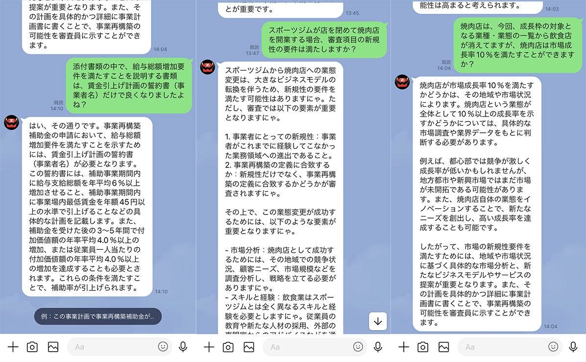補助金支援AIアシスタント「ズバッと(β)」は、OpenAIが2023年6月に公開したGPT-4-0613をモデルを基に構築され、膨大な文字数となる事業再構築補助金の公募要領を始め、申請に必要な知識を強化学習し、補助金の支援機関用に専門化されています。このGPTを活用した本ツールは、LINEチャットで提供することによりスマホでもPCでも、AIによる補助金の申請支援を提供します。