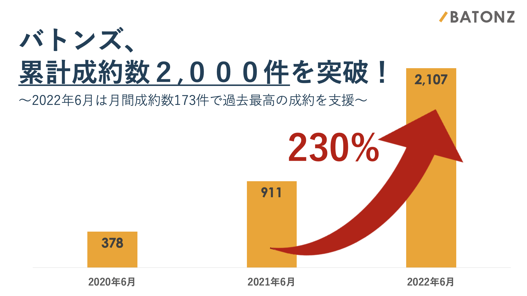 「BATONZ」は業界No.1※のM&A総合支援プラットフォームです。2020年12月から2021年6月までの成約数の伸び率は689件から911件と132%の伸び率でしたが、2021年12月から2022年6月までの成約数の伸び率は1,446件から2,107件と143%の伸び率で、前年同期比11ポイントの成長となりました。また、2021年6月から2022年6月の年間成長率は230%でした。加えて、2022年6月の月間成約数は173件と過去最高の月間成約数を記録しています。