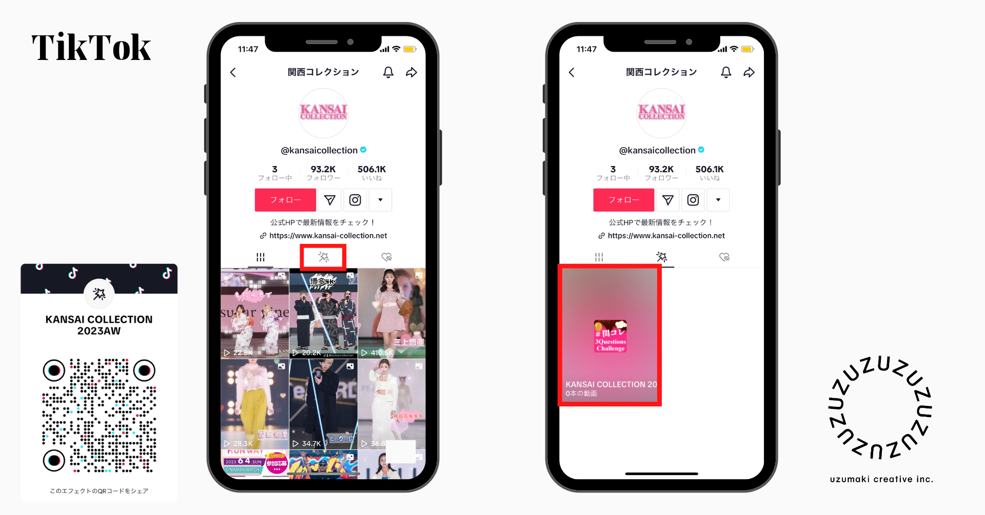今回製作したTikTokエフェクトは、KANSAI COLLECTIONに関連する質問を15秒以内で回答する質問系のエフェクトになっています。①ABOUT YOU②FASHON ③KANSAI COLLECTIONの3つのカテゴリーについてランダムの質問が出される仕掛けによって、撮影者が15秒以内に回答できるかどうかが見どころです。また、KANSAI COLLECTION 2023 A/Wの25回目Anniversaryをイメージとしたキービジュアルを踏襲した華やかなデザインになっております。TikTokでの撮影・投稿の際に是非ご活用ください。